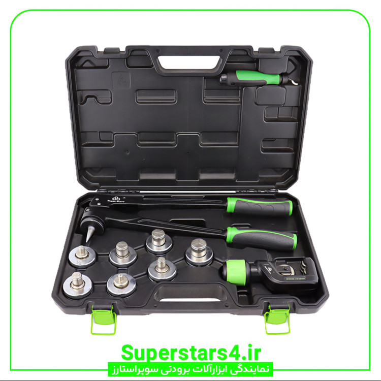 ست گشاد کن سوپر استارز دارای 7 لقمه مناسب گشاد کردن لوله مسی و دارای یک لوله بر بزرگ و یک عدد پلیسه گیر مدادی می باشد .